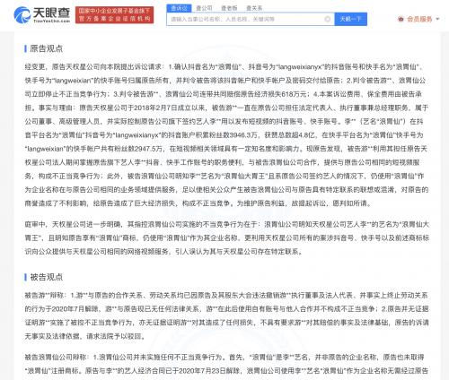 文书显示,原告天权星公司诉称,其自成立以来,被告游絮一直任公司董事、高级管理人员,并实际控制原告公司旗下签约艺人李杭泽(浪胃仙)用以发布短视频的抖音账号、快手账号。现原告发现,游絮利用职务便利,与被告浪胃仙公司合作,提供与原告公司相同的短视频服务,而浪胃仙公司明知李杭泽(浪胃仙)系原告公司签约艺人的情况下,仍使用“浪胃仙”作为企业名称在与原告公司相同的业务领域提供服务。