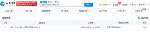 天眼查App显示,近日,北京光年之外科技有限公司新增一则简易注销公告,公告期为4月2日至4月22日,登记机关为北京市工商行政管理局海淀分局。不过,该简易注销公告已于4月2日被撤销。