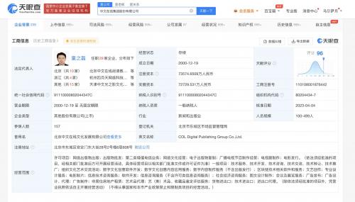该公司成立于2000年12月,于2015年1月在A股上市,法定代表人为童之磊。股东信息显示,该公司由童之磊、上海七猫文化传媒有限公司、上海阅文信息技术有限公司等共同持股。2022年12月,中文在线曾发公告称,为了更加全面地体现公司的产业布局和实际情况,拟将公司名称变更为“中文在线集团股份有限公司”。