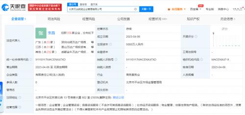 天眼查App显示,近日,北京万达锐驰企业管理有限公司成立,法定代表人为张晶,注册资本5000万人民币,经营范围含企业管理;企业管理咨询;信息咨询服务;社会经济咨询服务;物业管理;非居住房地产租赁。股东信息显示,该公司由大连万达商业管理集团股份有限公司全资持股。