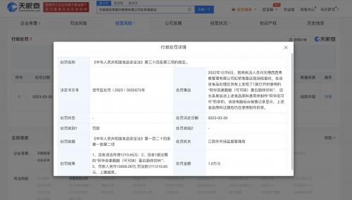 天眼查App显示,近日,无锡西西弗餐饮管理有限公司虹桥南路店因使用过期原料制作奶茶,被江阴市市场监督管理局罚款1万元、没收违法所得1210.65元及过期原料。