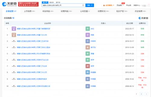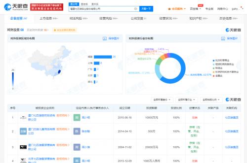 天眼查App显示,福建七匹狼实业股份有限公司成立于2001年7月,注册资本约7.56亿人民币,法定代表人、董事长为周少雄,经营范围包括服装制造;服装服饰批发;服装服饰零售等,由福建七匹狼集团有限公司、洪泽君、周少雄等共同持股。对外投资信息显示,该公司直接持股企业有58家,其中存续状态的有43家,包括上海七匹狼实业有限公司、厦门七匹狼服装营销有限公司、厦门七匹狼软件开发有限公司等,版图涵盖服饰、电商、文旅、投资等。此外,该公司在北京、厦门、泉州等地共拥有16家分支机构,其中12家已被注销或吊销。
