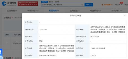 天眼查App显示,近日,小红书关联公司行吟信息科技(上海)有限公司因违反《网络出版服务管理规定》第二十四条第(九)项规定,被上海市文化和旅游局罚款3.5万元。据悉,上述规定明确:网络出版物不得含有危害社会公德或者民族优秀文化传统的内容。