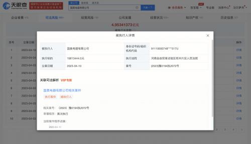 天眼查App显示,4月10日,国美电器有限公司新增一则被执行人信息,执行标的1981万余元,执行法院为河南自由贸易试验区郑州片区人民法院。