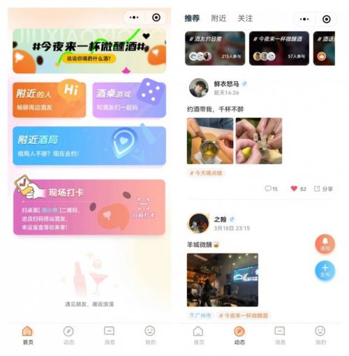 酒小熊APP将年轻人的约酒行为引入线上,为用户智能推荐附近酒局,实现快速组局,轻松交友。同时为了丰富体验,平台通过门店打卡、酒桌游戏等功能,帮助用户在线下的场景也可以快速地发现附近的朋友,体验更加有趣的社交。