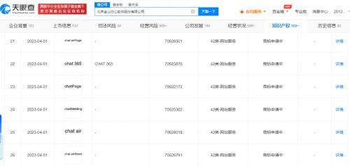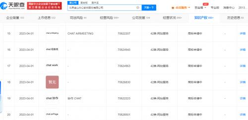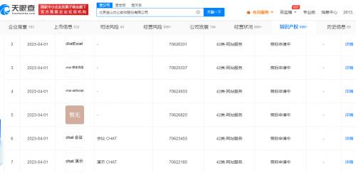 天眼查App显示,近日,北京金山办公软件股份有限公司申请注册多个“chat文档”“chat演示”“chat表单”“chat Office”“chat everything”商标,国际分类为网站服务,当前商标状态均为申请中。