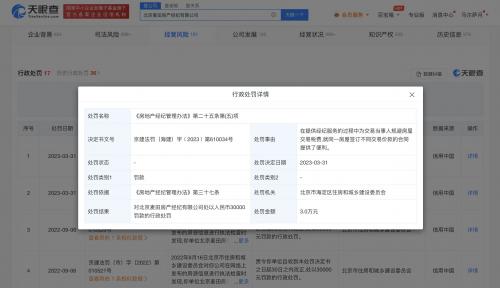 天眼查App显示,近日,北京麦田房产经纪有限公司因违反《房地产经纪管理办法》,被北京市海淀区住房和城乡建设委员会罚款3万元。处罚详情显示,该公司在提供经纪服务的过程中为交易当事人规避房屋交易税费,就同一房屋签订不同交易价款的合同提供了便利。