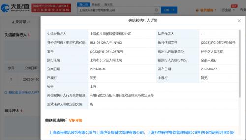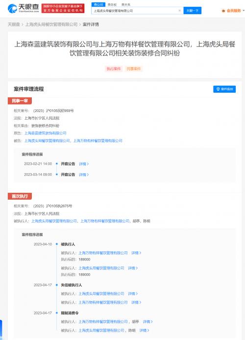 天眼查App显示,近日,因有履行能力而拒不履行生效法律文书确定义务,虎头局关联公司上海万物有样餐饮管理有限公司及子公司上海虎头局餐饮管理有限公司被上海市长宁区人民法院列为失信被执行人(老赖),并被限制高消费,涉及案件为上海森蓝建筑装饰有限公司与上述公司装饰装修合同纠纷。案件流程显示,不久前,虎头局两公司已因此案被强制执行18.9万。