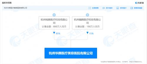 天眼查App显示,涉事公司为杭州华颜医疗美容医院有限公司,成立于2018年6月,注册资本1000万人民币,法定代表人及疑似实际控制人为张志远,经营范围包括医疗美容科,美容外科,美容皮肤科,美容牙科,美容中医科/麻醉科/医学检验科等。股东信息显示,该公司由杭州悦颜医疗科技有限公司、杭州俪颜医疗科技有限公司共同持股,持股比例分别为85%、15%。