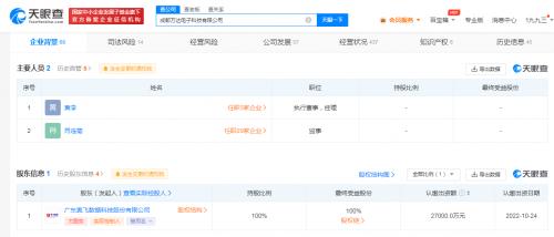 天眼查App显示,近日,成都万达电子科技有限公司发生工商变更,原股东大连万达集团咨询服务有限公司退出,新增股东广东奥飞数据科技股份有限公司并全资持股;同时,李荣智卸任法定代表人、执行董事,阎硕卸任经理,均由黄李接任。