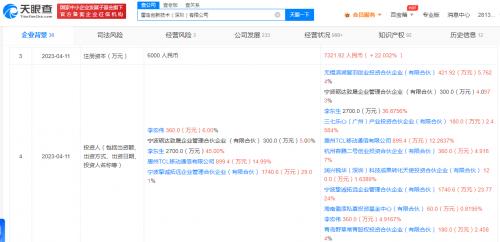 天眼查App显示,近日,雷鸟创新技术(深圳)有限公司发生工商变更,股东新增三七互娱旗下三七乐心(广州)产业投资合伙企业(有限合伙) 、无锡滨湖复羽创业投资合伙企业(有限合伙)等,同时公司注册资本由6000万人民币增至7321.92万人民币,增幅约22%。