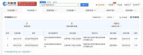 天眼查App显示,近日,因有履行能力而拒不履行生效法律文书确定义务,万达地产集团有限公司及旗下河源市福新创建有限公司、河源御海房地产开发有限公司被上海市第二中级人民法院2次列为失信被执行人(老赖),并被限制高消费。案件流程显示,上述公司此前已被分别被强制执行8.41亿元、2.46亿元。