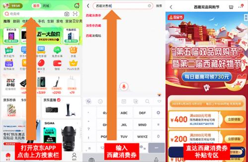 2023年4月28日至5月12日,第五届双品网购节暨第二届西藏好物节盛大开启,西藏本地的消费者可在京东领取消费券。现在只要打开京东APP,首页搜索“西藏消费券”进入活动专区,即可领取满4000元减400元、满2000元减200元、满1000元减100元和满300元减30元的四种不同面值的消费券。温馨提示,每个用户每天每张消费券限领取及核销一次,且同一用户在活动期间可多次领取、多次核销。如果你近期有购买3C数码产品的打算,不妨赶紧来看看,说不定就有你心仪的产品。