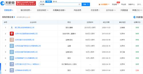 天眼查App显示,李亚鹏名下关联公司共8家,目前为存续状态的有7家,包括丽江雪山投资有限责任公司、北京中书艺莲网络科技有限公司、北京艺莲文化科技有限公司等,版图涉及投资、科技、传媒、影视等行业。所有存续状态企业中,李亚鹏直接持有5家公司的股权,在5家公司中担任董事长或董事、监事高管职位。