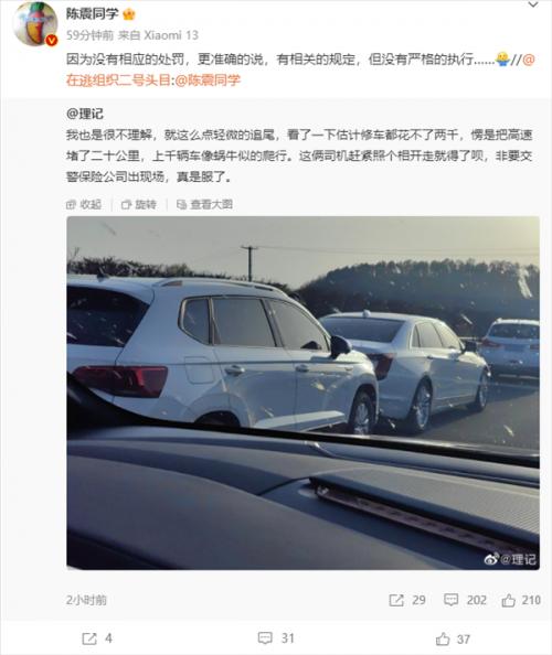 “我也是很不理解,就这么点轻微的追尾,看了一下估计修车都花不了两千,愣是把高速堵了二十公里,上千辆车像蜗牛似的爬行。这俩司机赶紧照个相开走就得了呗,非要交警保险公司出现场,真是服了。”