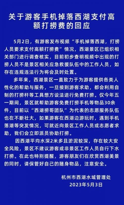 据杭州市西湖水域管理处发布的“关于游客手机掉落西湖支付高额打捞费的回应”显示:目前初步查明视频中出现的打捞人员不是景区相关应急救援队伍中的工作人员,如存在违规违法行为将会及时处置。