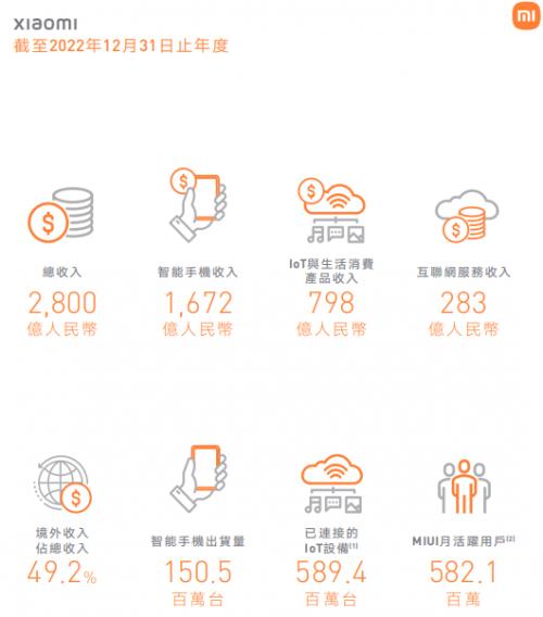 小米集团公布的年报显示,截止2022年12月31日止年度总收入2800亿元人民币,经调整净利润达85亿元人民币。其中,境外市场收入1378亿元人民币,占总收入比例为49.2%。