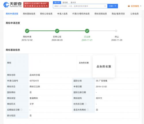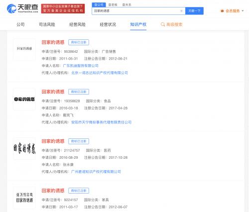 天眼查App显示,“回家的诱惑”“林品如”“品如的衣服”等商标已被多方申请注册,申请人包括服饰、电器、科技等公司及多名自然人,国际分类包括广告销售、食品、医药等,其中多枚商标已成功注册。