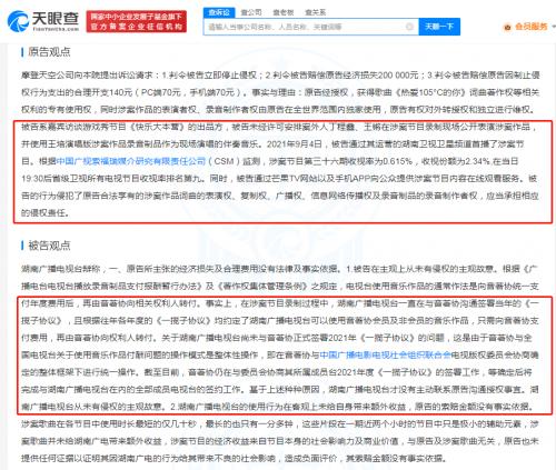 文书显示,原告摩登天空公司诉称,其经授权获得歌曲《热爱105°C的你》词曲著作权、表演者权、录音制作者权等专有使用权。被告系《快乐大本营》的出品方,其未经许可安排案外人丁程鑫、王锵在节目中表演该作品,并使用录音制品作为伴奏音乐,侵犯了原告权益。被告湖南广播电视台辩称,其主观上无侵权故意;仅将涉案歌曲进行现场表演,未侵犯原告的录音制作者权;根据湖南广播电视台与音著协历年签署的协议,其可以使用音著协会员及非会员的全部歌曲,电视台正与音著协协商2021-2022年协议内容,签署后将立即对涉案歌曲的使用向音著协付费。