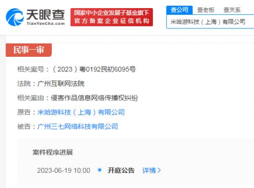 天眼查App显示,近日,米哈游科技(上海)有限公司与广州三七网络科技有限公司侵害作品信息网络传播权纠纷新增开庭公告,原告为米哈游科技(上海)有限公司,案件将于6月19日在广州互联网法院开庭。