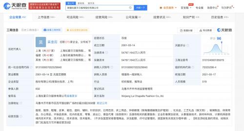 天眼查App显示,拉夏贝尔服饰(天津)有限公司成立于2012年12月,法定代表人为吴金应,注册资本1000万人民币,由新疆拉夏贝尔服饰股份有限公司全资持股。