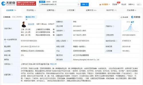 天眼查App显示,上海点晴信息科技有限公司发生工商变更,股东新增手游《明日方舟》开发方上海鹰角网络科技有限公司,同时,注册资本由约531万人民币增资至约549万人民币。