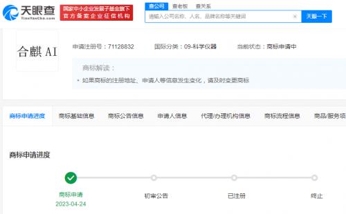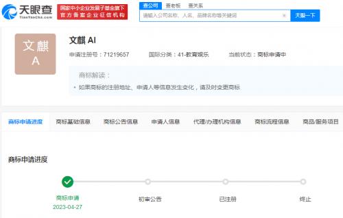 天眼查App显示,近日,武汉市多比特信息科技有限公司申请注册“文麒AI”“真麒AI”“合麒AI”“智启特AI”等多个商标,国际分类为科学仪器、教育娱乐、网站服务等,当前商标状态均为申请中。