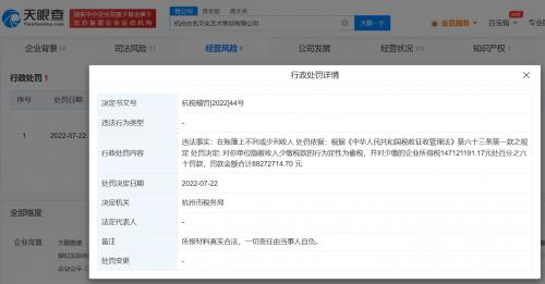 股东信息显示,该公司由于文红持股90%。值得一提的是,于文红名下杭州古名文化艺术策划有限公司曾因隐匿服务收入超47.5亿元从而少缴税款,被罚款8827万余元。