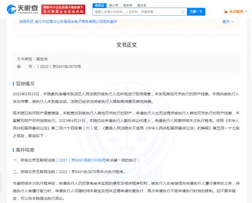 天眼查App显示,近日,迪丽热巴*迪力木拉提与山东喵品会电子商务有限公司相关案件执行裁定书公开。文书显示,法院已穷尽财产调查措施,未能查找到被执行人其他可供执行的财产,本案暂无财产可供继续执行,因此裁定终结本次执行程序,待被执行人有履行能力时,申请执行人可随时申请恢复执行。