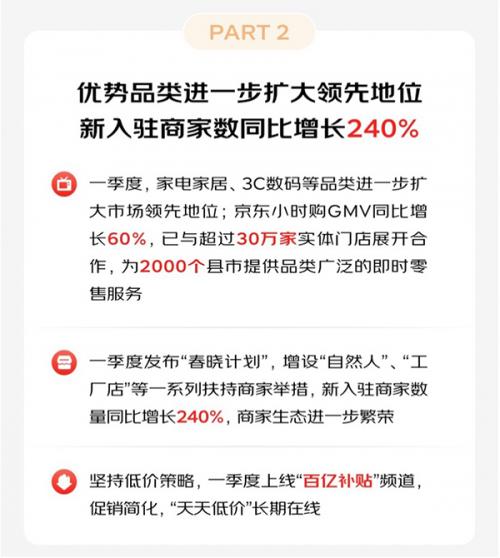5月11日,京东集团发布第一季度业绩报告,在成本、效率、体验“三效合一”变革下,京东的发展产生了更大的普惠价值。据财报显示,一季度家电家居等优势品类进一步扩大领先地位,新入驻商家数同比增长240%。二十年来,京东坚定地做实事、有价值的事、长期的事,蹚出了一条新型实体企业的高质量发展之路。