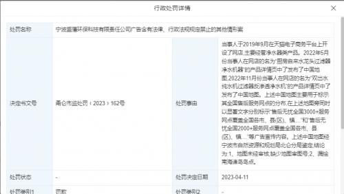 天眼查App显示,近日,宁波盛藩环保科技有限责任公司因广告含有法律、行政法规规定禁止的其他情形,被宁波市北仑区市场监督管理局罚款50万元。处罚详情显示,当事人在网店产品详情页中发布中国地图用于标示其售后服务网点分布。经鉴定,该地图未经审核,缺少地图审图号,且漏绘南海诸岛岛点。