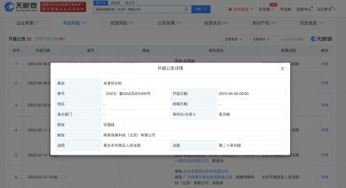 天眼查App显示,近日,网易传媒科技(北京)有限公司新增开庭公告,原告任国超(任嘉伦)因名誉权纠纷起诉该公司,案件将于6月8日在山东省青岛市市南区人民法院开庭审理。