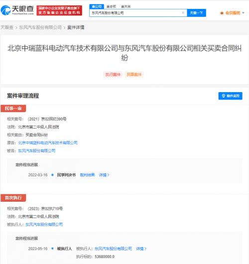 天眼查App显示,5月16日,东风汽车股份有限公司新增一则被执行人信息,执行标的5368万人民币,关联案件为北京中瑞蓝科电动汽车技术有限公司与该公司买卖合同纠纷,执行法院为北京市第二中级人民法院。
