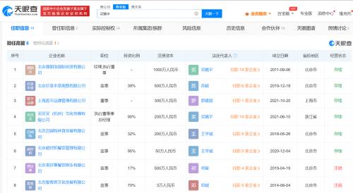 天眼查App显示,买超(本名买镜宇)关联的14家企业中11家为存续状态,包括北京盛朗浩国际投资有限公司、北京无名居酒业有限公司、上海姿态石商贸有限公司等,涉及体育、传媒、餐饮、商贸等领域。买超在2家企业中担任法定代表人,在6家企业中担任高管,并在9家企业中持有股份。