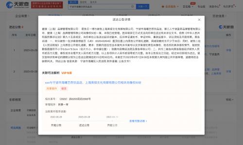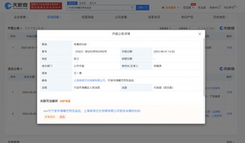 天眼查App显示,近日,宁波市海曙艺然饮品店、上海英铎文化传媒有限公司新增一则开庭公告,原告为王一博,案由为肖像权纠纷,案件将于6月1日再次开庭。2022年,法院曾发布两次该案件开庭公告。