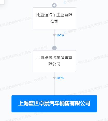天眼查App显示,近日,上海盛世卓景汽车销售有限公司成立,法定代表人为杨燕煌,注册资本100万人民币,经营范围含汽车销售;汽车零配件零售;第一类医疗器械销售;二手车经纪等。股权全景穿透图显示,该公司由比亚迪汽车工业有限公司间接全资持股。