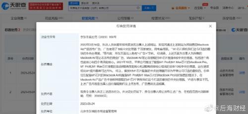 处罚详情显示,当事人所售的Macbook Air笔记本发布的商业广告称“M1芯片拥有我们迄今打造的最快的中央处理器”等内容,经调查,苹果公司已于2021年10月推出了配备M1 Pro和M1 Max芯片的MacBook Pro,运行速度相比M1提升最高可达70%。