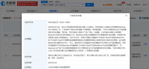 处罚事由显示,2022年2月,执法人员发现当事人发布的Macbook Air笔记本广告称“M1芯片拥有我们迄今打造的最快的中央处理器”等内容。经调查,苹果公司已于2021年10月推出配备M1 Pro和M1 Max芯片的MacBook Pro,运行速度相比M1提升最高可达70%,即案发时M1芯片配备的中央处理器并非为该公司打造的最快的中央处理器,广告内容与事实不符。