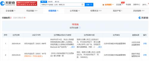 天眼查App显示,近日,苹果电子产品商贸(北京)有限公司因违规发布虚假广告,被北京市东城区市场监督管理局罚款20万元。