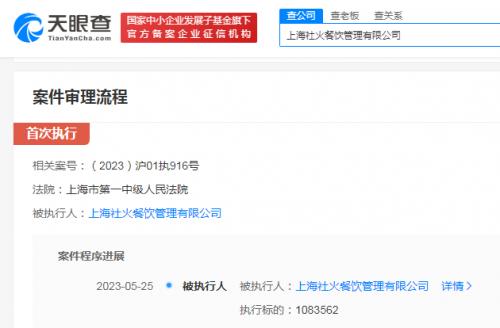 天眼查App显示,近日,上海社火餐饮管理有限公司新增一则被执行人信息,执行标的108万余元,执行法院为上海市第一中级人民法院。