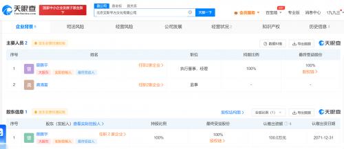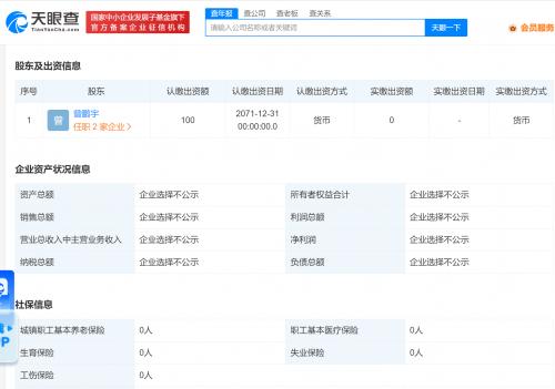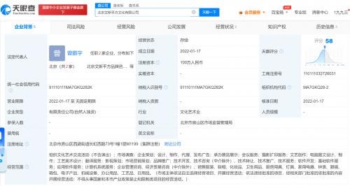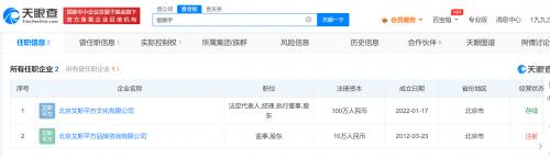 天眼查App显示,曾鹏宇共关联2家公司,其中,北京艾斯平方文化有限公司为存续状态。该公司成立于2022年1月,注册资本100万人民币,曾鹏宇担任法定代表人、执行董事、经理并全资持股,公司经营范围含组织文化艺术交流活动、文艺创作、影视策划、品牌推广等。最新年报信息显示,该公司2022年参保人数为0人。