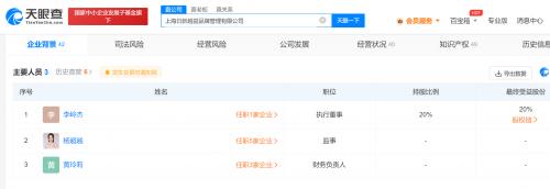 天眼查App显示,近日,上海日新越益品牌管理有限公司发生工商变更,杨超越退出股东行列,退出前其持股20%。目前,杨超越在该公司仍担任监事。