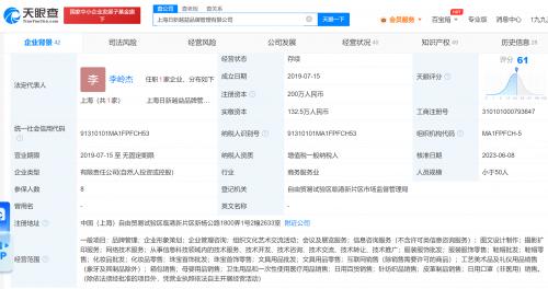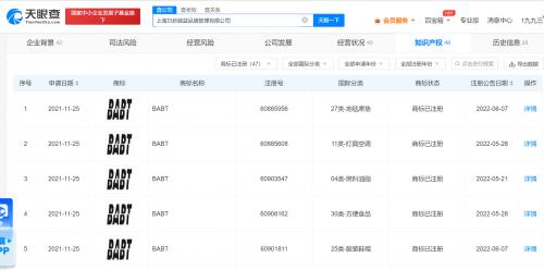 该公司成立于2019年7月,注册资本200万人民币,经营范围含品牌管理,服装服饰批发、零售,鞋帽批发、零售,化妆品批发、零售等,现由上海联焕企业管理中心(有限合伙)、李岭杰、上海焕新实业有限公司共同持股。知识产权信息显示,该公司已成功注册多个BABT相关商标。公开资料显示,杨超越为潮牌BABT主理人。