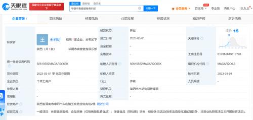 天眼查App显示,华阴市青健健身俱乐部成立于今年3月,是一家个体工商户,经营者为王某某,注册地址位于华阴市一宾馆2楼,经营范围含体育健康服务、食品销售、保健食品(预包装)销售、健身休闲活动。
