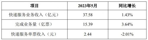 韵达股份发布5月快递服务主要经营指标快报,快递服务业务收入37.58亿元,同比增长1.43%;完成业务量15.39亿票,同比增长3.64%;快递服务单票收入2.44元,同比减少2.01%。