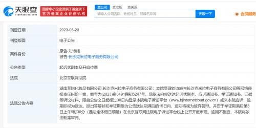 天眼查App显示,近日,北京互联网法院向湖南莱脱化妆品有限公司、长沙克米拉电子商务有限公司公告送达刘诗施(刘诗诗)与上述公司网络侵权责任纠纷一案诉讼材料,限自公告之日起经过30日内登录法院电子诉讼平台或到法院应诉,逾期即视为送达。案件定于举证期满后第3日线上开庭审理。