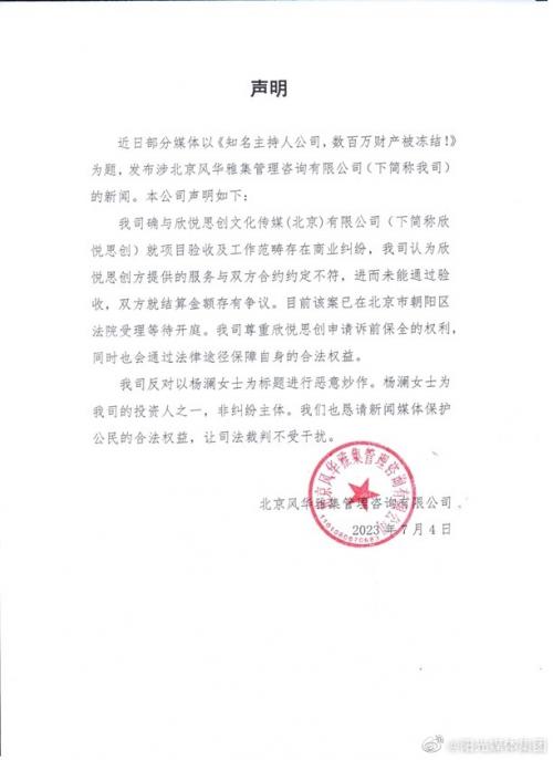 近日,多家媒体以《知名主持人公司,数百万财产被冻结》为题,发布主持人杨澜名下北京风华雅集管理咨询有限公司(下简称风华雅集)相关新闻,对此,风华雅集发表声明称:商业纠纷,尚未审理。