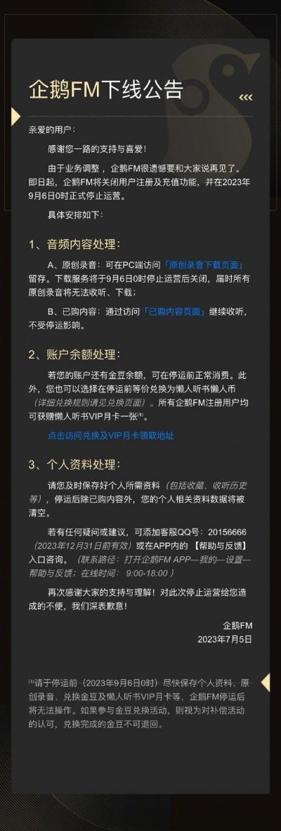 腾讯旗下音频平台企鹅FM今日发布下线公告,称由于业务调整,即日起,企鹅FM将关闭用户注册及充值功能,并在2023年9月6日0时正式停止运营。