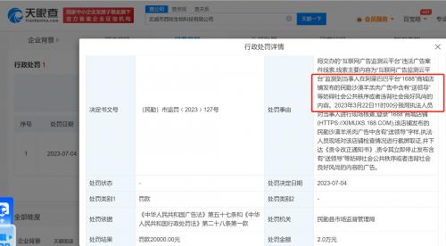 天眼查App显示,近日,武威市西牧生物科技有限公司因发布的广告中含有妨碍社会公共秩序或者违背社会良好风尚的内容,被民勤县市场监督管理局罚款2万元。处罚详情显示,该公司在网店发布的沙漠羊羔肉广告中含有“送领导”字样。