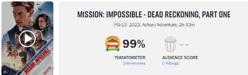 截止发稿,当前新鲜度指数已升至99%,成为阿汤哥有史以来评分最高的影片作品,也是《碟中谍》系列的最佳成绩。
